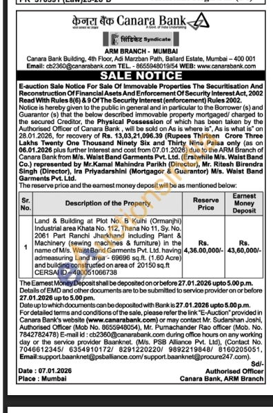 Land & Building at Plot No. B Kulhi (Ormanjhi) Industrial area Khata No. 112, Thana No 11. Sy. No. 2061 Part Ranchi Jharkhand including Plant & Machinery (sewing machines & furniture) in the name of M/s. Waist Band Garments Pvt. Ltd. having admeasuring Land area-69696 sq.ft. (1.60 Acre) and building constructed on area of 20150 sq.ft CERSAI ID-400051066738