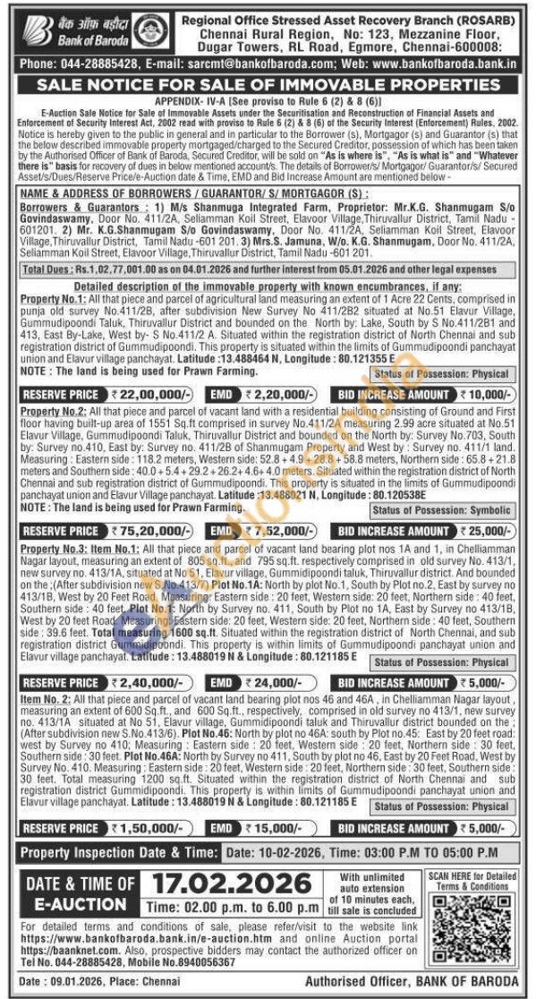 Property No.3: Item No.1: All that piece and parcel of vacant land bearing plot nos 1A and 1, in Chelliamman Nagar layout, measuring an extent of 805 sq.ft, and 795 sq.ft. respectively comprised in old survey No. 413/1, new survey no. 413/1A, situated at No 51, Elavur village, Gummidipoondi taluk, Thiruvallur district. And bounded on the (After subdivision new S.No.413/7) Plot No.1A: North by plot No. 1, South by Plot no.2. East by survey no 413/18, West by 20 Feet Road. Measuring: Eastern side: 20 feet, Western side: 20 feet, Northern side: 40 feet, Southern side: 40 feet. Plot No.1: North by Survey no. 411, South by Plot no 1A, East by Survey no 413/18, West by 20 feet Road. Measuring: Eastern side: 20 feet, Western side: 20 feet, Northern side: 40 feet, Southern side: 39.6 feet. Total measuring 1600 sq.ft. Situated within the registration district of North Chennai, and sub registration district Gummidipoondi. This property is within limits of Gummudipoondi panchayat union and Elavur village panchayat. Latitude: 13.488019 N & Longitude: 80.121185 E