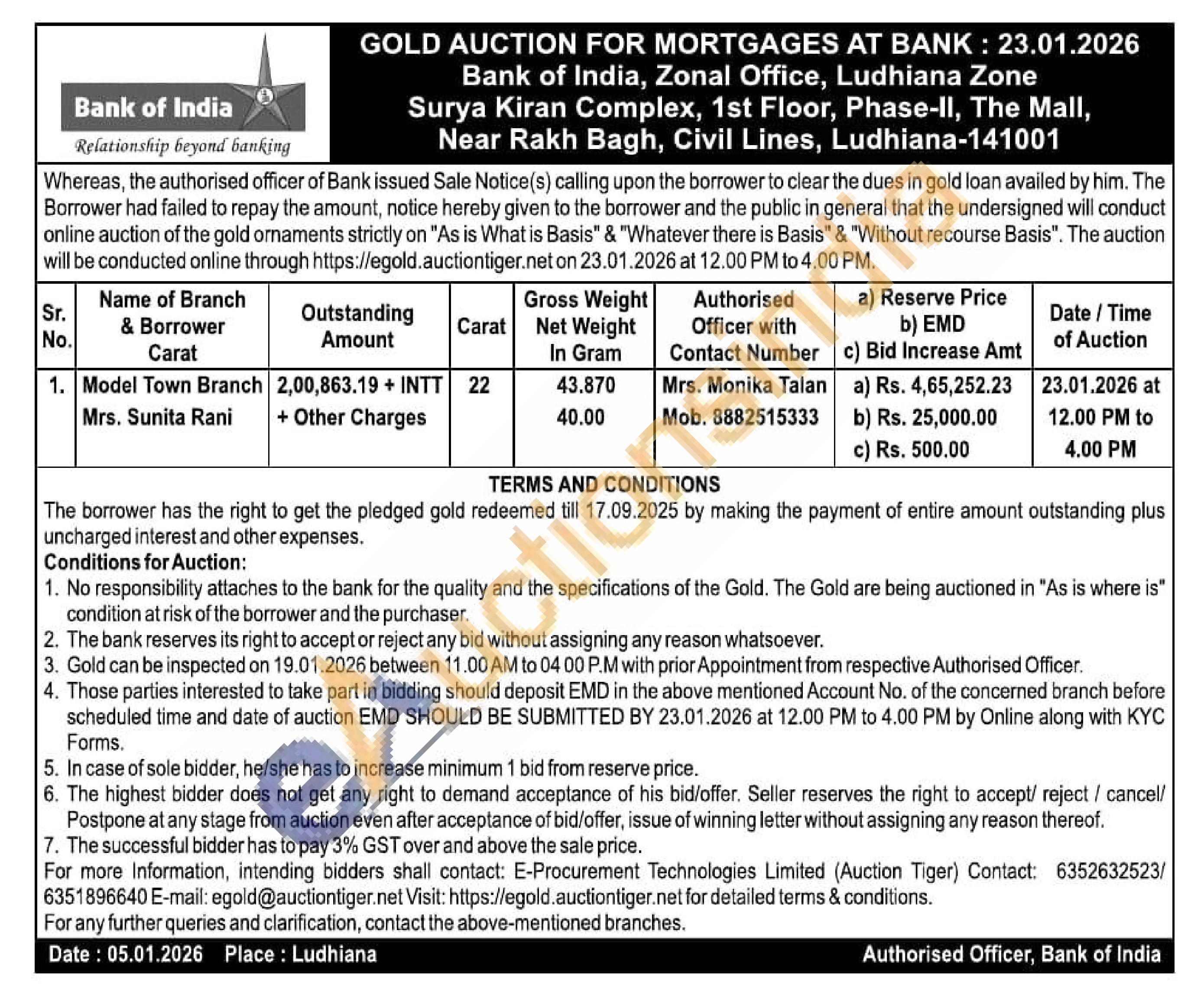 Bank of India Gold Auctions Auction in Ludhiana