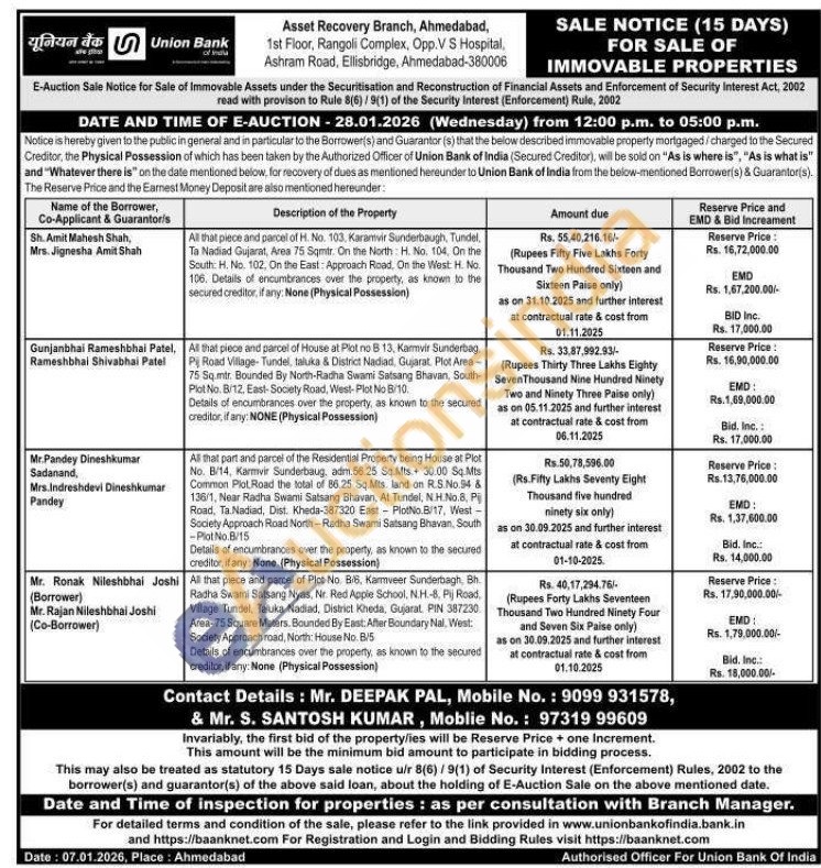 All that part and parcel of the Residential Property being House at Plot No. 8/14, Karmvir Sunderbaug, adm.56.25 Sq.Mts 30.00 Sq.Mts Common Plot Road the total of 86.25 Sq.Mts. land on R.S.No.54 & 136/1, Near Radha Swami Satsang Bhavan, At Tundel, N.H.No.8, Pij Road, Ta Nadiad, Dist. Kheda-387320 East PlotNo.B/17, West-Society Approach Road North-Radha Swami Satsang Bhavan, South -Plot No.B/15 Details of encumbrances over the property, as known to the secured creditor, if any: None (Physical Possession)