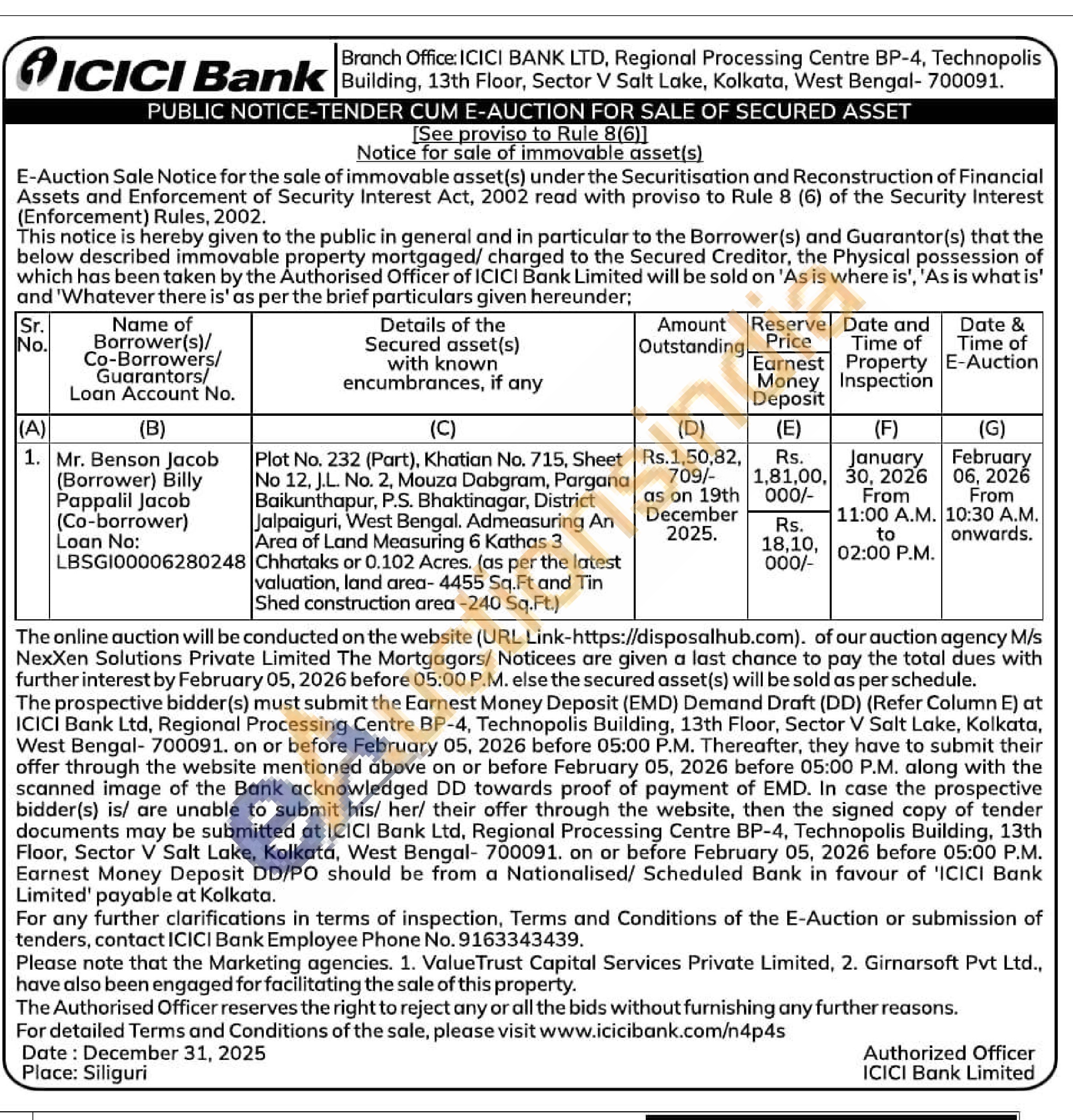 Plot No. 232 (Part), Khatian No. 715, Sheet No 12, J.L. No. 2, Mouza Dabgram, Pargana Baikunthapur, P.S. Bhaktinagar, District Jalpaiguri, guri, West Bengal. Admeasuring An Area of Land Measuring 6 Kathas 3 Chhataks or 0.102 Acres. (as per the latest valuation, land area-4455 Sq.Ft and Tin Shed construction area -240 Sq.Ft.)