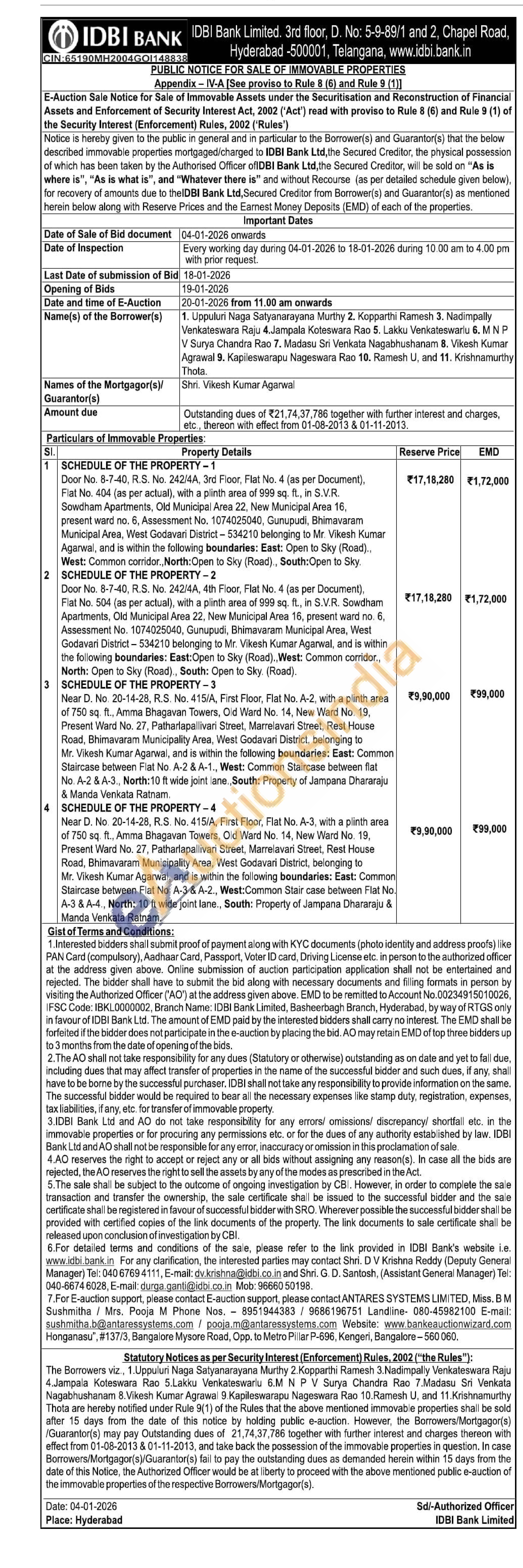 Door No. 8-7-40, R.S. No. 242/4A, 3rd Floor, Flat No. 4 (as per Document), Flat No. 404 (as per actual), with a plinth area of 999 sq. ft., in S.V.R. Sowdham Apartments, Old Municipal Area 22, New Municipal Area 16, present ward no. 6, Assessment No. 1074025040, Gunupudi, Bhimavaram Municipal Area, West Godavari District - 534210 belonging to Mr. Vikesh Kumar Agarwal, and is within the following boundaries: East: Open to Sky (Road)., West: Common corridor., North: Open to Sky (Road)., South: Open to Sky.