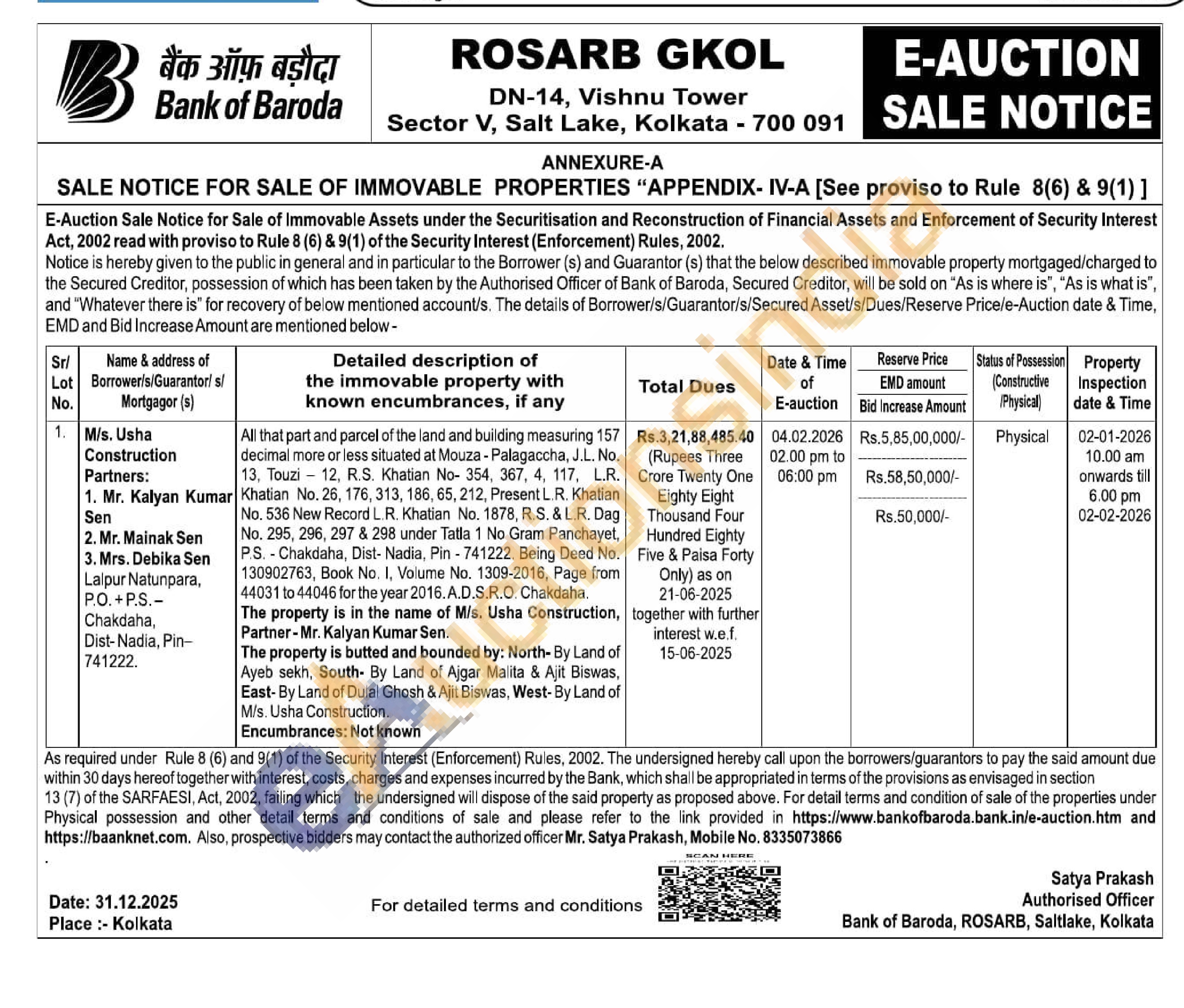 All that part and parcel of the land and building measuring 157 decimal more or less situated at Mouza - Palagaccha, J.L. No. 13, Touzi 12, R.S. Khatian No- 354, 367, 4, 117, L.R. Khatian No. 26, 176, 313, 186, 65, 212, Present L.R. Khatian No. 536 New Record L.R. Khatian No. 1878, R S. & L.R. Dag No. 295, 296, 297 & 298 under Tatla 1 No Gram Panchayet, PS.-Chakdaha, Dist- Nadia, Pin-741222. Being Deed No. 130902763, Book No. I, Volume No. 1309-2016, Page from 44031 to 44046 for the year 2016.A.D.S.R.O. Chakdaha.