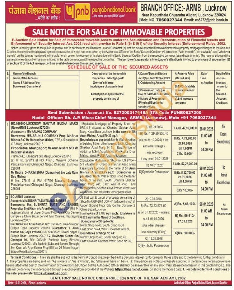 1.Equitable Mortgage of Property Shop no. 97/3-4-5 situated at Chandra Sekhar Azad Marg, Kasai Bara Lucknow in the name of Sh Arun Mishra. Area 570.33 sq.ft.Boundaries as per deed: North: Wall of portion of building & then other houses, South Chandra Shekhar Azad Marg 24 ft. East Portion of Abdul hai & Smt Asha Mishra Wio Rudra Dhar Mishra, West IP of Sh. Anwarul & Azeem