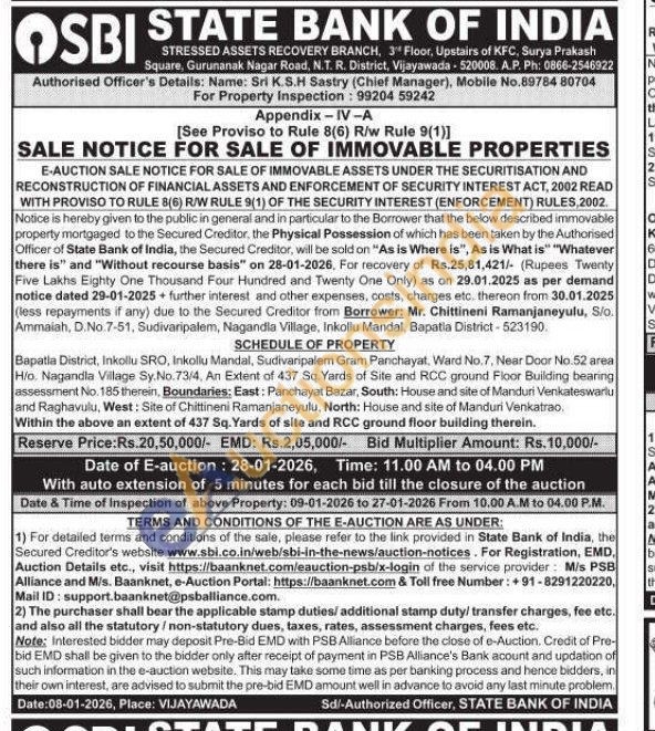 Bapatla District, Inkollu SRO, Inkollu Mandal, Sudivaripalem Gram Panchayat, Ward No. 7, Near Door No.52 area H/o. Nagandla Village Sy.No. 73/4, An Extent of 437 Sq. Yards of Site and RCC ground Floor Building bearing assessment No. 185 therein, Boundaries: East: Panchayat Bazar, South: House and site of Manduri Venkateswarlu and Raghavulu, West: Site of Chittineni Ramanjaneyulu, North: House and site of Manduri Venkatrao. Within the above an extent of 437 Sq. Yards of site and RCC ground floor building therein