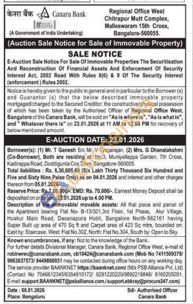 Description of the immovable! movable assets: All that piece and parcel of the Apartment bearing Flat No- B-13/301,3rd Floor, 1st Phase, Alur Village, Huskur Main Road, Dasanapura Hobli, Bangalore North-562161 having Super Built up area of 470 Sq ft and Carpet area of 423 Sq mtrs, bounded on: East by: Staircase, West: Flat No. 302, North: Flat No.304, South by: Open to Sky
