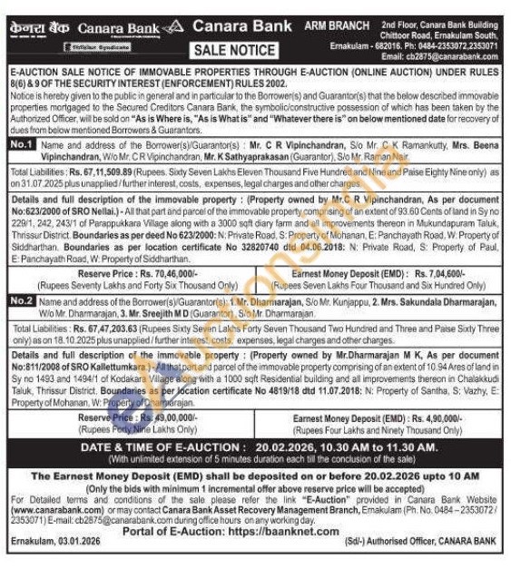 Details and full description of the immovable property: (Property owned by Mr.Dharmarajan MK, As per document No:811/2008 of SRO Kallettumkara.) All that part and parcel of the immovable property comprising of an extent of 10.94 Ares of land in Sy no 1493 and 1494/1 of Kodakara Village along with a 1000 sqft Residential building and all improvements thereon in Chalakkudi Taluk, Thrissur District. Boundaries as per location certificate No 4819/18 dtd 11.07.2018: N: Property of Santha, S: Vazhy, E Property of Mohanan. W: Property of Dharmarajan