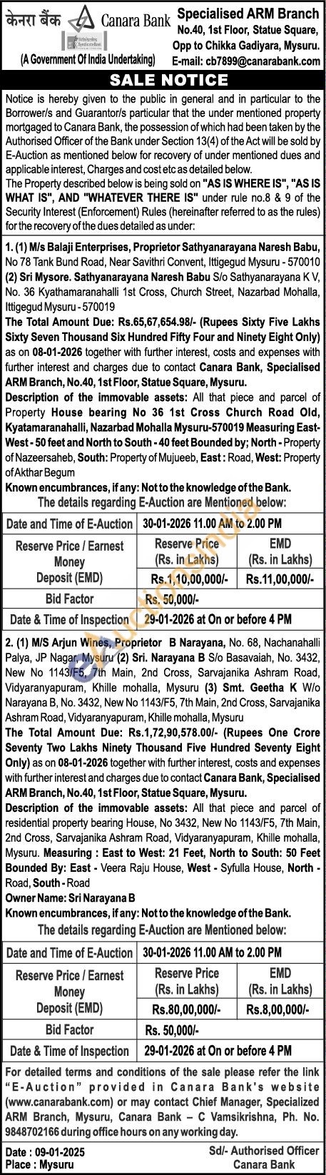 Description of the immovable assets: All that piece and parcel of residential property bearing House, No 3432, New No 1143/F5, 7th Main, 2nd Cross, Sarvajanika Ashram Road, Vidyaranyapuram, Khille mohalla, Mysuru. Measuring: East to West: 21 Feet, North to South: 50 Feet Bounded By: East - Veera Raju House, West Syfulla House, North -Road, South - Road