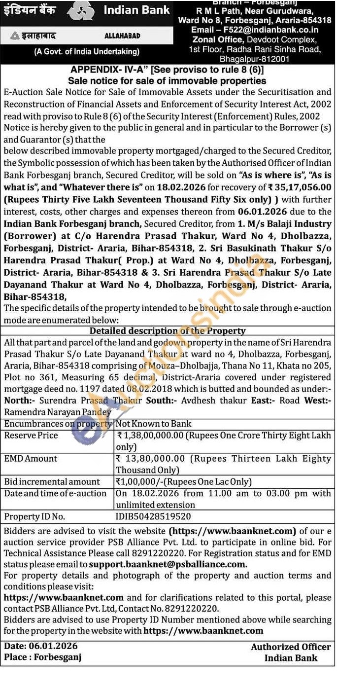 All that part and parcel of the land and godown property in the name of Sri Harendra Prasad Thakur S/o Late Dayanand Thakur at ward no 4, Dholbazza, Forbesganj, Araria, Bihar-854318 comprising of Mouza-Dholbajja, Thana No 11, Khata no 205, Plot no 361, Measuring 65 decimal, District-Araria covered under registered mortgage deed no. 1197 dated 08.02.2018 which is butted and bounded as under:-North:- Surendra Prasad Thakur South: Avdhesh thakur East: Road West:-Ramendra Narayan Pandey