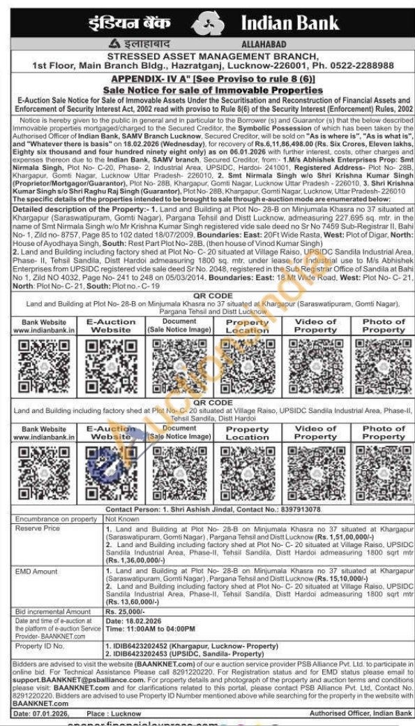 Detailed description of the Property:- 1. Land and Building at Plot No-28-8 on Minjumala Khasra no 37 situated at Khargapur (Saraswatipuram, Gomti Nagar), Pargana Tehsil and Distt Lucknow, admeasuring 227.695 sq. mtr, in the name of Smt Nirmala Singh w/o Mr Krishna Kumar Singh registered vide sale deed no Sr No 7459 Sub-Registrar II, Bahi No-1, Zild no-8757, Page 85 to 102 dated 18/07/2009, Boundaries: East: 20Ft Wide Rasta, West: Plot of Digar, North: House of Ayodhaya Singh, South: Rest Part Plot No-28B. (then house of Vinod Kumar Singh) 2. Land and Building including factory shed at Plot No-C-20 situated at Village Raiso, UPSIDC Sandila Industrial Area, Phase- II, Tehsil Sandila, Distt Hardoi admeasuring 1800 sq. mtr. under lease for Industrial use to Mis Abhishek Enterprises from UPSIDC registered vide sale deed Sr No. 2048, registered in the Sub Registrar Office of Sandila at Bahi No 1, Zild NO 4032, Page No-241 to 248 on 05/03/2014, Boundaries: East: 18 Mt Wide Road, West: Plot No-C-21, North: Plot No-C-21, South: Plotno-C-19