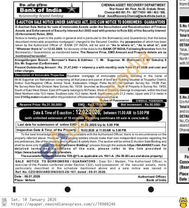Mr.M.Sugumar s/o Mahadevan comprising all that piece and parcel of land and building situated at Tirupattur District, Ambur Sub-Registrar Office, Ambur Taluk, Kadavalam Village, Patta No.60, Old Natham Survey No. 19/2B Part, Re Survey New Sub-Division New Survey No. 19/38 bounded as Boundaries: North of Property in Survey No. 19/55, South of East West Street, East of Property belongs to M.Palani, West of Property belongs to shapnam, within this East West Northern side 10.0 meter, Southem side 10.2 meter, North South lower side 21.2 meter, Upper side 21.0 meter in total 214 Sq.meter situated within the jurisdiction of Kadavalam village panchayat.