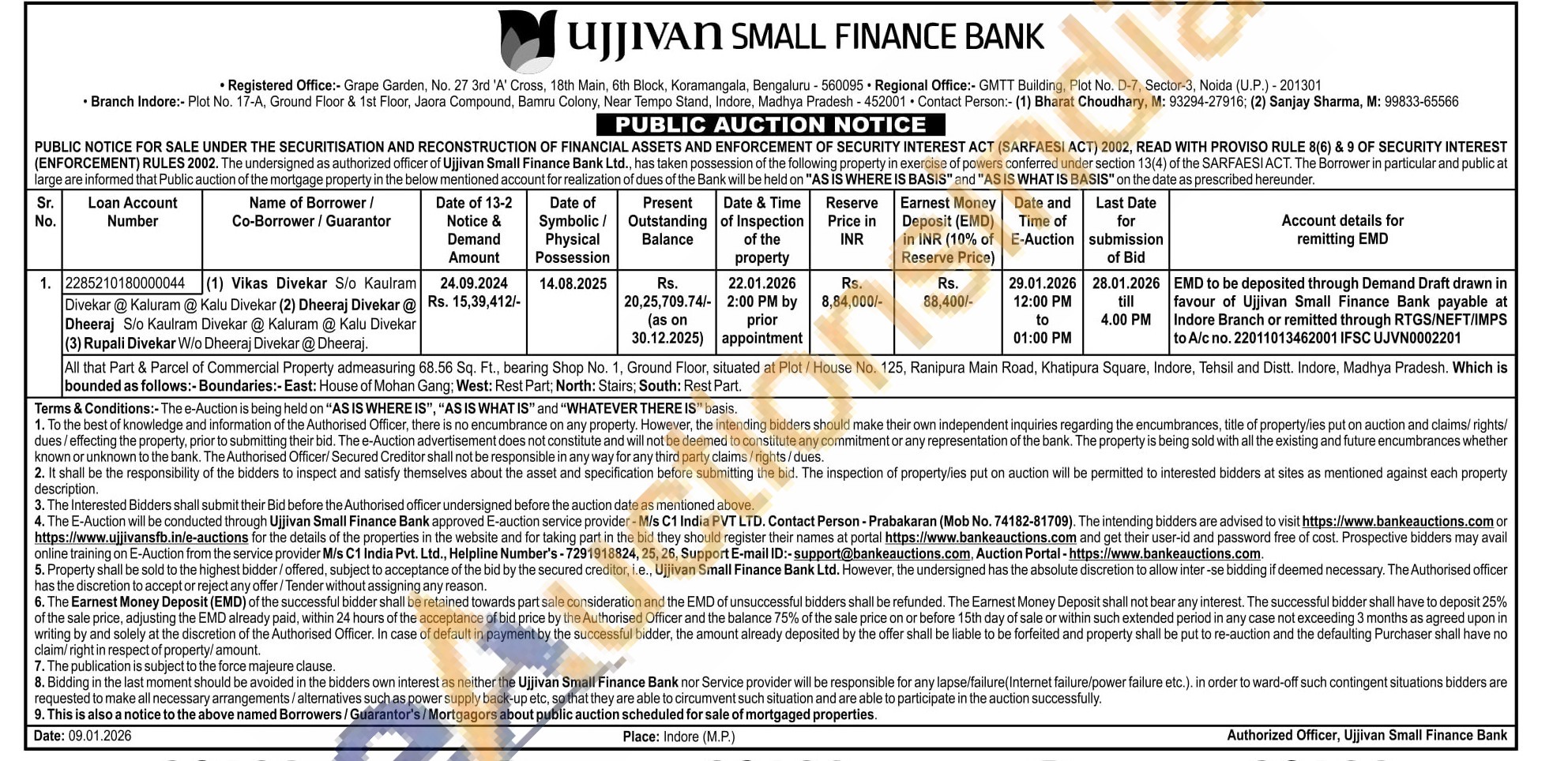 All that Part & Parcel of Commercial Property admeasuring 68.56 Sq. Ft., bearing Shop No. 1, Ground Floor, situated at Plot/ House No. 125, Ranipura Main Road, Khatipura Square, Indore, Tehsil and Distt. Indore, Madhya Pradesh. Which is bounded as follows:- Boundaries:-East: House of Mohan Gang; West: Rest Part; North: Stairs; South: Rest Part