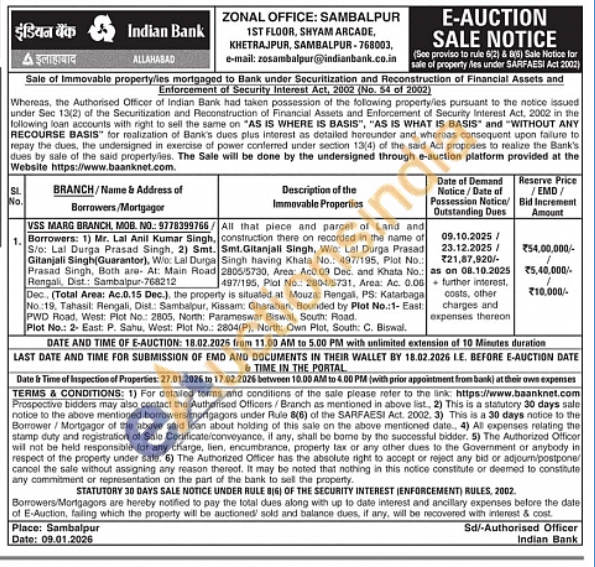All that piece and parcel of Land and construction there on recorded in the name of . Smt.Gitanjali Singh, W/o: Lal Durga Prasad having Khata No.: 497/195, Plot No.: Road 2805/5730, Area: Ac0.09 Dec. and Khata No.: 497/195, Plot No.: 2804/5731, Area: Ac. 0.06 Dec., (Total Area: Ac.0.15 Dec.), the property is situated at Mouza: Rengal, PS: Katarbaga No. 19, Tahasil Rengali, Dist. Sambalpur, Kissam: Gharabari, Bounded by Plot No.:1- East PWD Road, West: Plot No.: 2805, North: Parameswar Biswal, South: Road. Plot No.: 2- East: P. Sahu, West: Plot No.: 2804(P), North: Own Plat, South: C. Biswal