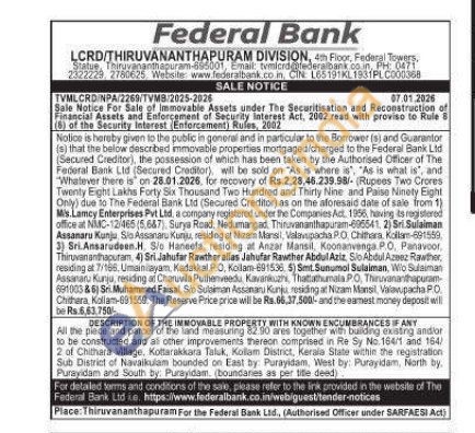 All the place and parcel of the land measuning 82.90 ares together with building existing andior to be constructed and al other improvements thereon comprised in Re Sy No. 164/1 an and 164/2 of Chithara Village, Kottarakkara Taluk, Kollam District, Keralis State within the registration Sub District of Navaikulam bounded on East by Purayidam, West by: Purayidam, North by Purayidam and South by Purayidam. (boundaries as per title deed)