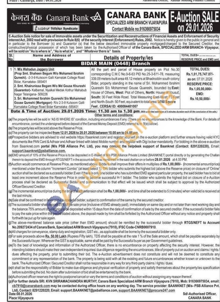 All the part and parcel of House property on Plot No.30 corresponding C.M.C No.9-6-63 PID No 25-3-611-78, measuring 339.09 meters-built area 48.12 meters at Bhadroddin south colony Bidar, property standing in the name of Sri. Mohammed Ibrahim Quareshi S/o Mohammed Gouse Quareshi, bounded by East: House of Others, West: Plot of Others, North: House of Yousuf, South: 30 Feet Wide Road. Total Measuring East-West: 73 Feet and North-South: 50 Feet, equivalent to total area: 3650 Square ft