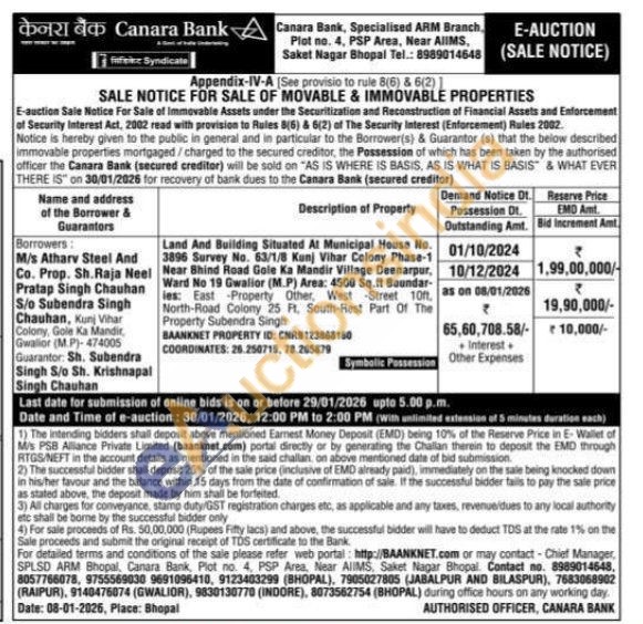 Land And Building Situated At Municipal House No. 3896 Survey No. 63/1/8 Kunj Vihar Colony Phase-1 Near Bhind Road Gole Ka Mandir Village Deenarpur, Ward No 19 Gwalior (M.P) Area: 4500 Sq.ft Boundar-les: East Property Other, West Street 10ft, North-Road Colony 25 Ft. South-Rest Part Of The Property Subendra Singh