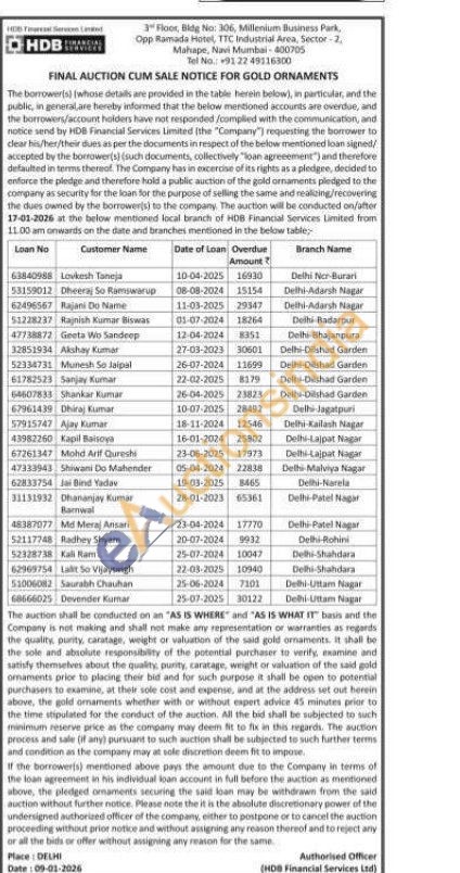 HDB Financial Services Limited Gold Auctions Auction in New Delhi