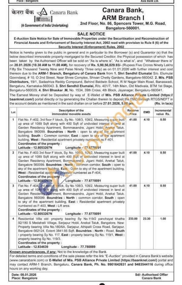 Flat No. F-404, 3rd floor, F block, Sy No. 108/3, 108/2, Measuring super built up area of 1089 Sqft along with 400 Sqft of undivided interest in land at Garden Residency Apartment, Bommasandra, Jigani Hobli, Anekal Taluk, Bangalore 560099. Boundries: North common corridor, South: open to sky of the apartment building, East: Residential apartment privately numbered as F-403, West: Lift area.