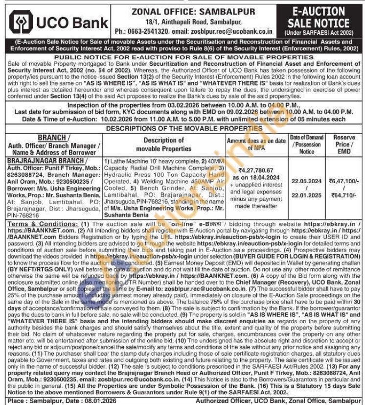 1) Lathe Machine 10' heavy complete, 2) 40MM Capacity Radial Drill Machine Complete, 3) Hydraulic Press 100 Ton Capacity Hand Operated, 4) Welding Machine 450AMP Air Cooled, 5) Bench Grinder, At: Sanjob, Lamtibahal, PO Brajarajnagar, Dist.: Jharsuguda, PIN-768216, standing in the name of M/s. Usha Engineering Works, Prop.: Mr. Sushanta Benia