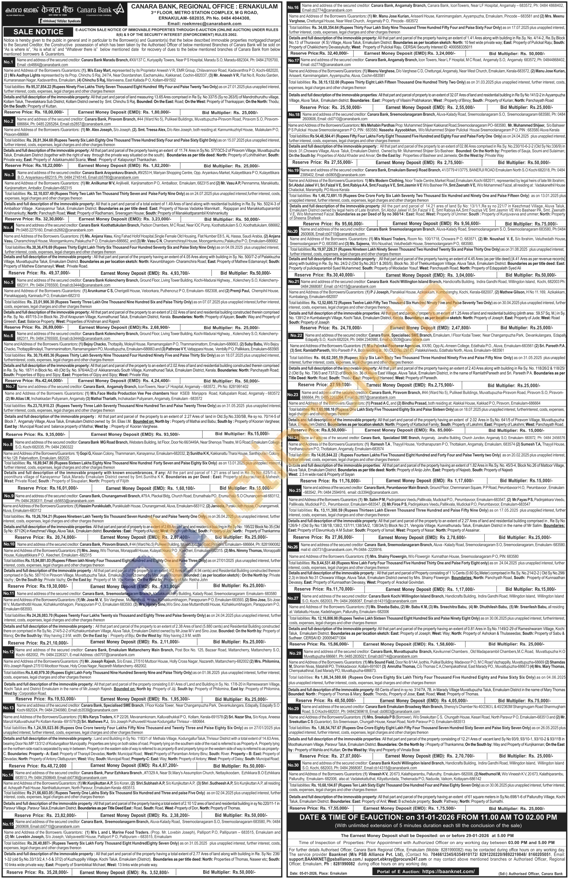 Details and full description of the immovable property: All that part and parcel of the property to an extent of 2.02 Ares of land and residential building constructed therein comprised in Re. Sy. No. 187/1 in Block No. 48 (Old Sy. No. 976/4A/2) of Aikkarannadu South Village, Kunnathunad Taluk, Emakulam District, Kerala. Boundaries: North: Panchayath Road; South: Properties of Bijoy and Sijoy; East: Properties of Gijoy and Sijoy: West: Private Way