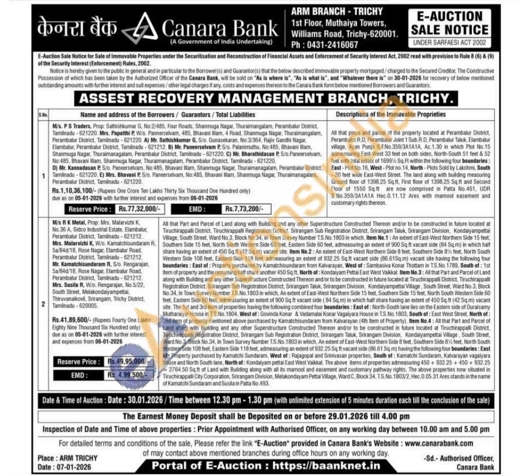 All that piece and parcel of the property located at Perambalur District, Perambalur R.D. Perambalur Joint 1 Sub RD. Perambalur Taluk, Elambalur village, Ayan Punja S.F.No.359/3A1A1A, Ac.1.30 in which Plot No 15 admeasuring East-West 33 feet on both sides, North-South 51 feet & 52 feet with total extent of 1699% Sq Ft within the following four boundaries: East-Plot No. 16, West-Plot no. 14, North-Plots Sold by Lakshmi, South -20 feet wide East-West Street. The land along with building measuring Ground floor of 1398.25 Sqft. First floor of 1398.25 Sq.ft and Second Floor of 1550 Sqft are now comprised in Patta No.461, UDR S.No.359/3A1A1A Hec.0.11.12 Ares with mamool easement and customary rights thereon
