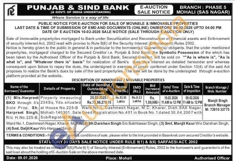 Property measuring 234 Sq. Yds.situated at House No.225-B Ward No.1, Dashmesh Nagar, M.C. Kharar, Distt. SAS Nagar, Mohali-140301, Sale Deed Registration No.401 in Book No. 1 dated 30.04.2007 with Sub Registrar, Kharar.