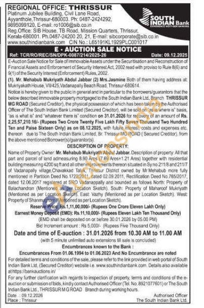 All that part and parcel of land admeasuring 8.90 Ares (7.69 Ares 1.21 Ares) together with residential building measuring 4200 sq ftand all other improvements thereon situated in Sy no.211/8 and 211/7 of Vadanapally vilage Chavakkad Taluk, Thrissur District owned by Mr Menabub more fully mentioned in Partition Deed No. 1722/2011, dated 02.09.2011, Rectification Deed No. 765/2017, dated 12.06.2017 registered at SRO Vadanappally and bounded as follows North: Property of Balachandran (Mentioned as per Location Sketch). South Property of Maharoof Muknyath (Mentioned as per Location Sketch). East Vazhy (Mentioned as per Location Sketch). West Property of Shanmugham (Mentioned as per Location Sketch)