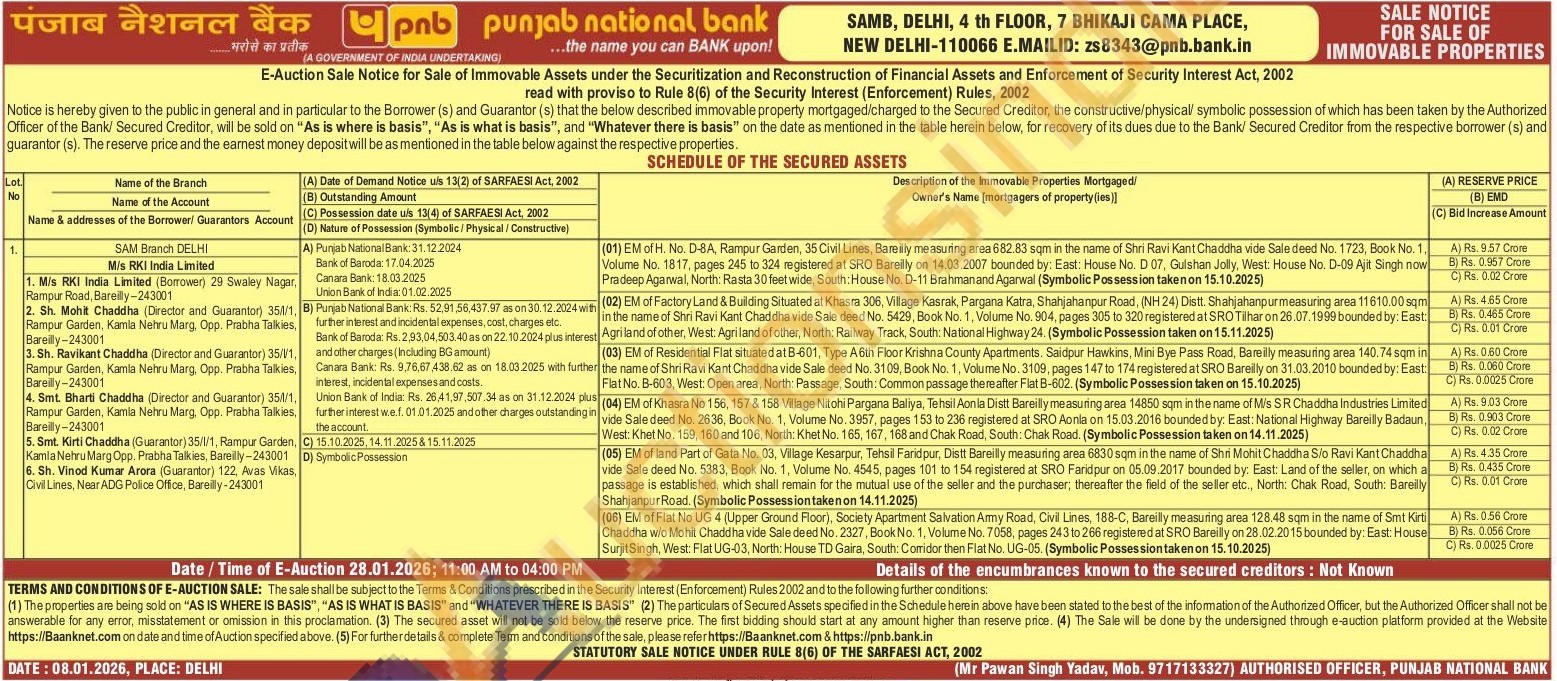 (02) EM of Factory Land & Building Situated at Khasra 306, Village Kasrak Pargana Katra, Shahjahanpur Road. (NH 24) Distt. Shahjahanpurmeasuring area 11610.00 sqm in the name of Shri Ravi Kant Chaddha vide Sale deed No. 5429, Book No. 1, Volume No. 904, pages 305 to 320 registered at SRO Tähar on 26.07.1999 bounded by: East: interest Agri land of other, West: Agri land of other, North: Railway Track, South: National Highway 24. (Symbolic Possession taken on 15.11.2025)
