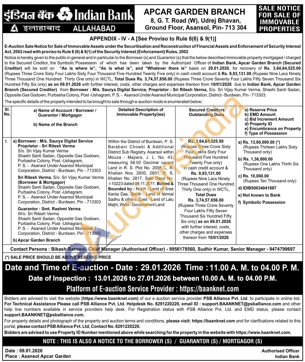 Within the District of Burdwan, P. S. Barabani Chowki & Additional District Sub Registry, Asansol within Mouza Majiara, J. L. No. 43, measuring 58.00 Decimal vacant Land in R. S. Plot No. 2008, L. R. Khatian Nos. 2600, 2601, R. S. Khatian No. 2817, Sale Deed No. 1-10223 dated 09.11.2011. Butted & Bounded by: North Land of Sree Kanta Das, South Land of Nirmal Sadhu & others, East - Land of Lalu Majhi, West-Government Land