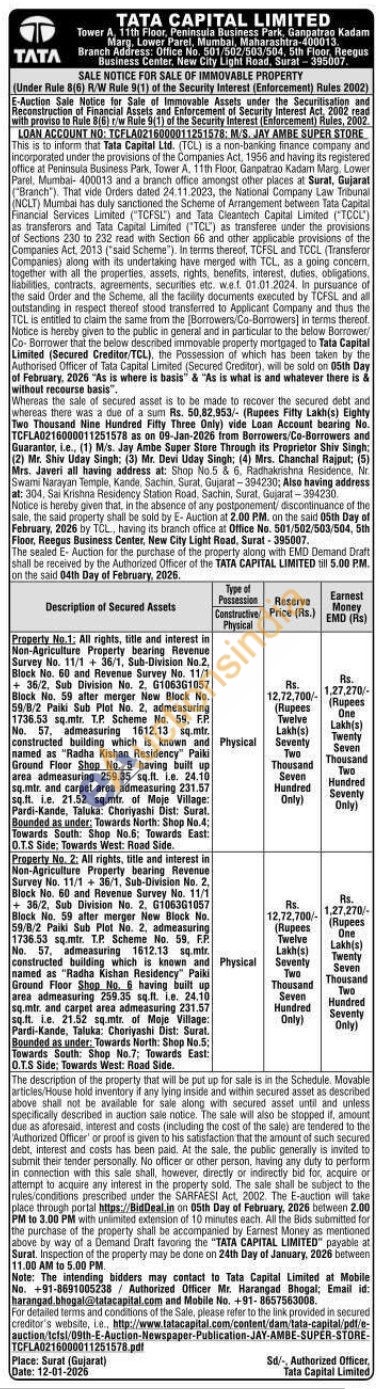 Property No. 2: All rights, title and interest in Non-Agriculture Property bearing Revenue Survey No. 11/1+ 36/1, Sub-Division No. 2, Block No. 60 and Revenue Survey No. 11/1 +36/2, Sub Division No. 2, G1063G1057 Block No. 59 after merger New Block No. 59/B/2 Paiki Sub Plot No. 2, admeasuring 1736.53 sq.mtr. T.P. Scheme No. 59. F.P. No. 57, admeasuring 1612.13 sq.mtr. constructed building which is known and named as "Radha Kishan Residency" Paiki Ground Floor Shop No. 6 having built up area admeasuring 259.35 sq.ft. i.e. 24.10 sq.mtr. and carpet area admeasuring 231.57 sq.ft. i.e. 21.52 sq.mtr. of Moje Village: Pardi-Kande, Taluka: Choriyashi Dist: Surat. Bounded as under: Towards North: Shop No.5: Towards South: Shop No.7: Towards East: O.T.S Side: Towards West: Road Side