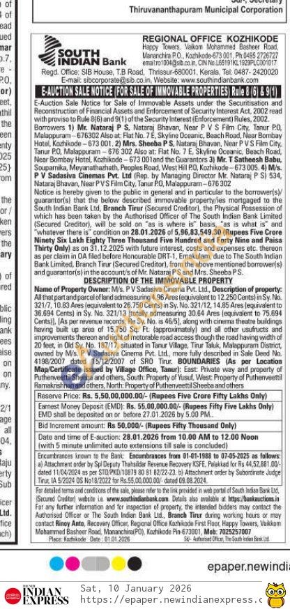 All that part and parcel of land admeasuring 4.96 Ares (equivalent to 12.250 Cents) in Sy. No. 321/7, 10.83 Ares jequivalent to 26.750 Cents) in Sy. No. 321/12, 14,85 Ares (equivalent to 36.694 Cents) in Sy. No. 321/13 (totally admeasuring 30.64 Ares (equivalent to 75.694 Cents)), (As per revenue records, Re Sy. No. is 46/5), along with cinerna theatre buildings having built up area of 15,750 Sq. Ft. (approximately) and all other usufructs and improvements thereon and right of motorable road access though the road having width of 20 feet, in Old Sy. No. 187/17, situated in Tanur Village, Tirur Taluk, Malappuram District, owned by Ms. PV Sadasiva Cinema Pvt. Ltd., more fully described in Sale Deed No. 4198/2007 dated 15/12/2007 of SRO Tirur. BOUNDARIES (As per Location Map/Certificate issued by Village Office, Tanur): East: Private way and property of Puthenveettil Sheeba and others, South: Property of Yusuf, West: Property of Puthenveettil Ramakrishnan and others, North: Property of Puthenveettil Sheeba and others.