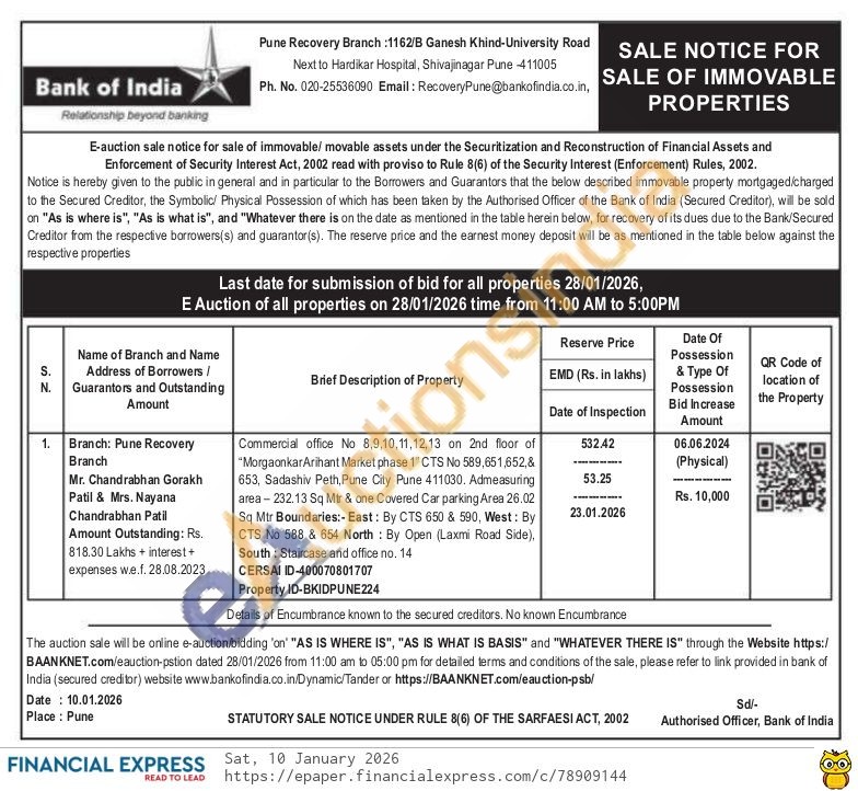 Commercial office No 8,9,10,11,12,13 on 2nd floor of "Morgaonkar Arihant Market phase 1" CTS No 589,651,652,8 653, Sadashiv Peth, Pune City Pune 411030. Admeasuring area-232.13 Sq Mtr & one Covered Car parking Area 26.02 Sq Mtr Boundaries:- East: By CTS 650 & 590, West: By CTS No 588 & 654 North By Open (Laxmi Road Side), South: Staircase and office no. 14