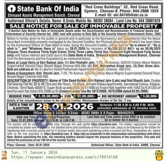 Duplex Flat bearing Flat No.38 & 48 (3rd and 4th Floor), 1st Block, Arihant Shloka Apartments, Secretariat Colony, Kilpauk, Chennai, Tamil Nadu 600010, Super Built up area 3332 Sq ft (1666 sq ft each flat) together with 1043 Sq ft of UDS ofland for each flat (total UDS 2086 sq ft) (Covered under Doc No 1872/2006, 1875/2006 dated 03.05.2006)