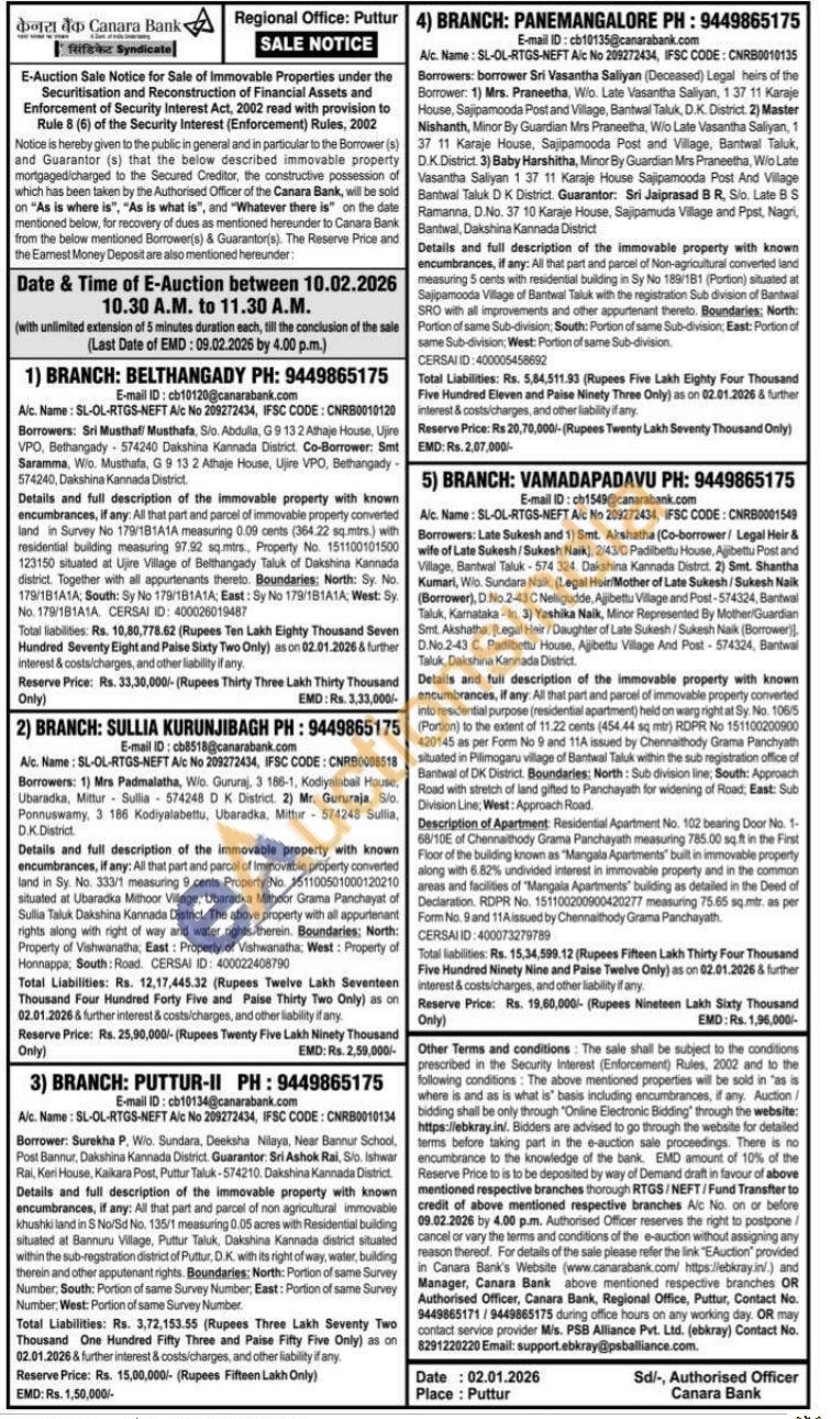 2) All that part and parcel of Immovable property converted land in Sy. No. 333/1 measuring 9 cents Property No. 151100501000120210 situated at Ubaradka Mithoor Village, Ubaradka Mithoor Grama Panchayat of Sullia Taluk Dakshina Kannada District. The above property with all appurtenant rights along with right of way and water rights therein. Boundaries: North: Property of Vishwanatha, East: Property of Vishwanatha: West: Property of Honnappa: South: Road. CERSAI ID: 400022408790 Total Liabilities: Rs. 12,17,445.32 (Rupees Twelve Lakh Seventeen Thousand Four Hundred Forty Five and Paise Thirty Two Only) as on 02.01.2026 & further interest & costs/charges, and other liability if any.