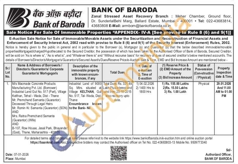 Industrial Land of 9000 Sq. Mirs. situated at Village KELTHAN, Gut No. 517, Tal- Wada, Dist-Thane Encumbrance known to the Bank-Nil