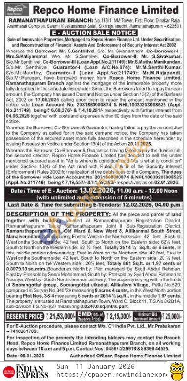 All the piece and parcel of land together with building situated at Ramanathapuram Registration District, Ramanathapuram Taluk, Ramanathapuram Joint II Sub-Registration District, Ramanathapuram Town, Old Ward 6, New Ward 8, Allikanmai South Street, Manaivennilam; Admeasuring; East to West on the Northem side: 42 feet, East to West on the Southern side: 42 feet, South to North on the Eastern side: 62% feet. South to North on the Western side. 62% feet, Totally 2614% Sq.ft. or 6 cents, in this, middle portion admeasuring East to West on the Northern side: 42 feet, East to West on the Southern side: 42 feet, South to North on the Eastern side: 20% feet, South to North on the Western side 20% feet, Totally 861 Sq.ft. or 1.97 cents or 0.0079.99 sq.mtrs. Boundaries: North by: Plot managed by Syed Abdul Rahman, East by: Plot sold by Seeni Mohammed, South by: Plot sold by Syed Abdul Rahman to Nooriya, West by: South North common pathway. The property is lying within the limits of Soorangottai group. Soorangottai utkadai, Allikulam Village, Patta No.529, comprised in Survey No. 345/2A measuring 9 acres 4 cents, in this West North portion bearing Plot Nos, 3 & 4 measuring 6 cents or 2614% sq.ft., in this middle 1.97 cents. The property is situated at Ramanathapuram Town, Ward C, Block 11, TS.No 8/281A, sub-division T.S.No. 8/27 measuring 0.0240.0 sq.mtrs. part