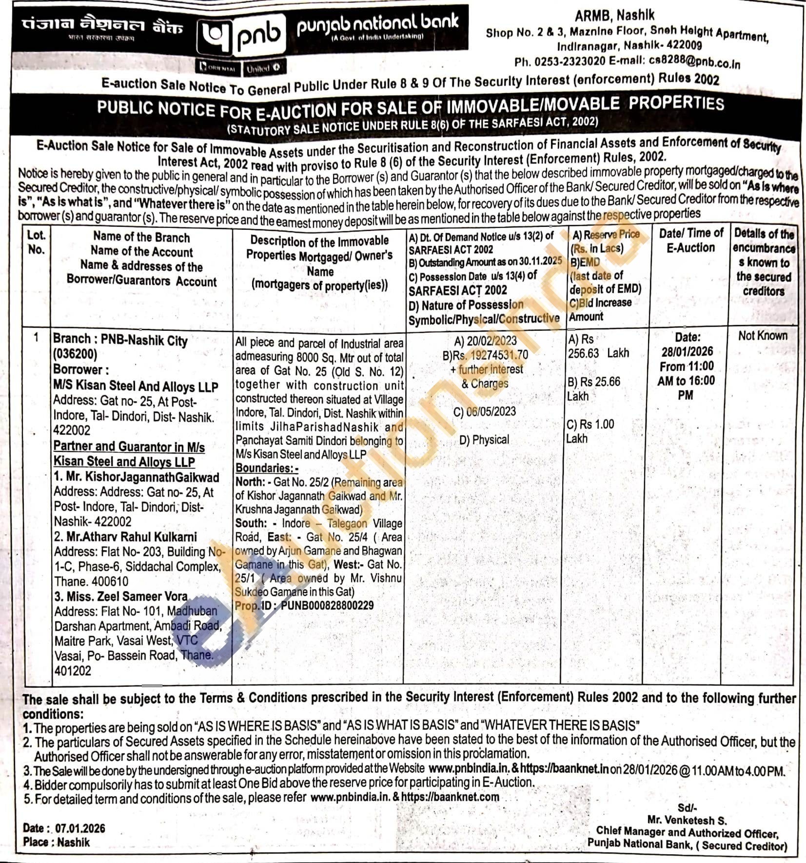 All piece and parcel of Industrial area admeasuring 8000 Sq. Mtr out of total area of Gat No. 25 (Old S. No. 12) together with construction unit constructed thereon situated at Village Indore, Tal. Dindori, Dist. Nashik within limits Jilha Parishad Nashik and Panchayat Samiti Dindori belonging to M/s Kisan Steel and Alloys LLP