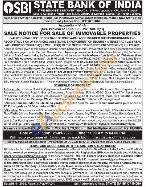 A-Shcedule: Krishna District, Vijayawada East District Registrar Limits, Kankipadu Sub Registrar Area, Penamaluru Mandal, Poranki Grama Panchayat, Poranki Village, R.S.No.460/5, Door No.9-77/4, Assessment No.5729 an extent of 942.32 sq.yds of site and Bounded by: East: Panchayat Road-30 ft. South: Property of Thalasila Lakshmi Padmaja, West: Panchayat Road, North: Patamata Pumping Canal Between four boundaries 942.32 sq.yards or 787.902 sq.mtrs, out of which undivided joint share of 47.116 sq.yrds or 39.39 sq.mtrs of Site. B-Shcedule: Above mentioned A Schedule Total Site constructed an Apartment Name and Style of "Venkatram Towers" First Floor, Flat No.201 and Bounded by: East: Open to Sky, South: Open to Sky, West: Common Corridor, North: Open to Sky. Within these boundaries Flat No.201 in First Floor, with plinth area 1119.25 sq.ft, including common area 70.0 sq.ft & Car Parking area 120.0 sq.ft, with attached All kind of Iron, wood products, current service No. 10280, current fittings, letrin, bathroom, lift, common area, water etc., with common rights, all easementary rights