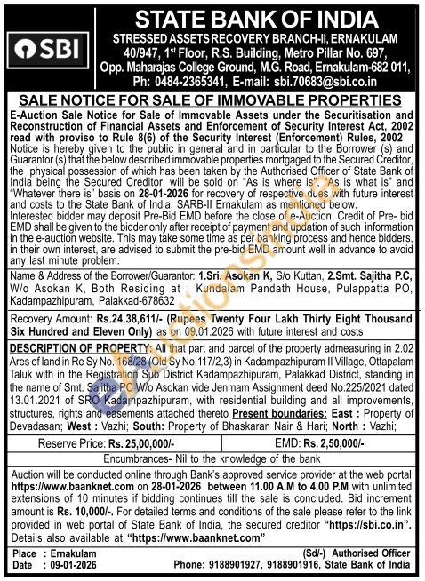 DESCRIPTION OF PROPERTY: All that part and parcel of the property admeasuring in 2.02 Ares of land in Re Sy No. 168/28 (Old Sy No. 117/2,3) in Kadampazhipuram II Village, Ottapalam Taluk with in the Registration Sub District Kadampazhipuram, Palakkad District, standing in the name of Smt. Sajitha PC W/o Asokan vide Jenmam Assignment deed No:225/2021 dated 13.01.2021 of SRO Kadampazhipuram, with residential building and all improvements, structures, rights and easements attached thereto Present boundaries: East: Property of Devadasan; West: Vazhi; South: Property of Bhaskaran Nair & Hari; North: Vazhi;