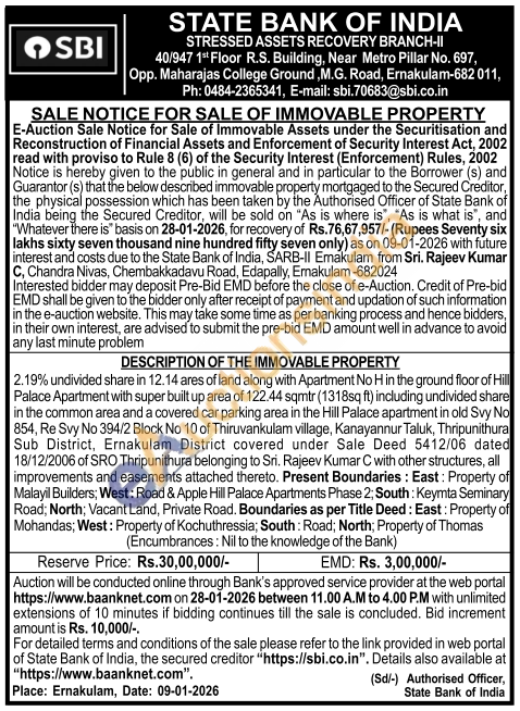 2.19% undivided share in 12.14 ares of land along with Apartment No H in the ground floor of Hill Palace Apartment with super built up area of 122.44 sqmtr (1318sq ft) including undivided share in the common area and a covered car parking area in the Hill Palace apartment in old Svy No 854, Re Svy No 394/2 Block No 10 of Thiruvankulam village, Kanayannur Taluk, Thripunithura Sub District, Ernakulam District covered under Sale Deed 5412/06 dated 18/12/2006 of SRO Thripunithura belonging to Sri. Rajeev Kumar C with other structures, all improvements and easements attached thereto. Present Boundaries: East: Property of Malayil Builders; West: Road & Apple Hill Palace Apartments Phase 2; South: Keymta Seminary Road; North; Vacant Land, Private Road. Boundaries as per Title Deed: East: Property of Mohandas; West: Property of Kochuthressia; South: Road; North; Property of Thomas