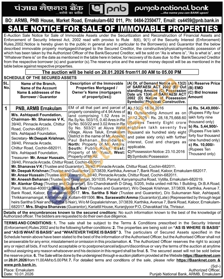 EM of all that part and parcel of property consisting of 4.94 Ares of land comprising 1.52 Ares in Re.Sy No. 503/15, 0.40 Ares in Re Sy No. 503/22 and 3.02 Ares in Re Sy No. 503/21 at Aluva West Village, Aluva Taluk, Ernakulam Paul Behanan. Boundaries: District in the name of Mr. Aneesh North: Property of Mr. Antony. South: Public Road. East: Property of Mr. Yusuf. West: Property of Mr.Ali.