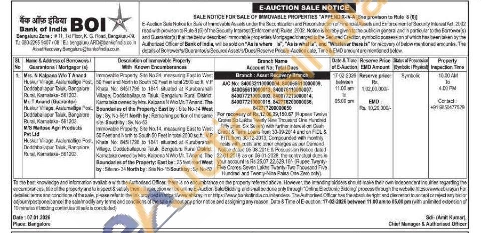 Immovable Property, Site No.34, measuring East to West Post, 50 Feet and North to South 50 Feet in total 2500 sq.ft, VP Khata No: 845/1798 to 1841 situated at Kurubarahalli Village, Doddaballapura Taluk, Bengaluru Rural District, Kamataka owned by Mrs. Kalpana N W/o Mr. T Anand. The , Boundaries of the Property: East by: Site No-14 West by: Sy. No-56/1 North by: Remaining portion of the same site. South by: Sy. No-53 Immovable Property, Site No. 14, measuring East to West 50 Feet and North to South 50 Feet in total 2500 sq.ft, V.P Khata No: 845/1798 to 1841 situated at Kurubarahalli Village, Doddaballapura Taluk, Bengaluru Rural District, Karnataka owned by Mrs. Kalpana N W/o Mr. T.Anand. The Boundaries of the Property: East by: 25 feet road West by: Site no-34 North by: Site No-15 South by: Sy. No-53