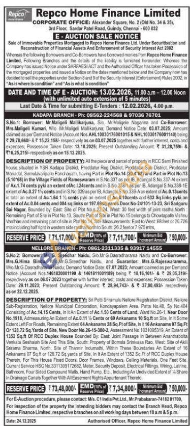 DESCRIPTION OF PROPERTY: Sri Patti Sriramulu Nellore Registration District, Nellore Sub-Registration, Nellore Municipal Corporation, Kondayapalem Area, Patta No.48. Sy No.404 Consisting of Ac. 14.15 Cents, In It An Extent of Ac.1.50 Cents of Land, Ward No.26-1, Near Door No.1918, Admeasuring An Extent of Ac.0.11% Cents or 69 Ankanams 10 Sq.ft on Site, in it Some Extent Left For Roads, Remaining Extent 64 Ankanams 28 Sq. Ft of Site, in it 16 Ankanams 07 Sq.Ft Or 128.72 Sq. Yards of Site, New Door No.26-15-380-2, Assessment No. 1031096319, An Extent of 1352 Sq.ft Of RCC Duplex House Bounded By. East: Joint Passage in Between Ananthabolta Venkata Seshaiah Site And This Site. South: Property of Bomsla Srinivasa Rao, West Site of Akli Srirama Sharma, North: Site of Thanmir Indumathi, Within These Boundaries An Extent of 16 Ankanams 07 Sqft or 128.72 Sq yards of Sitte, In It An Extent of 1352 Sq. Ft of RCC Duplex House Therein, For This House Fixed Doors, Door Frames, Windows, Ceiling Materials, One Feet Site. Cument Service HSC No.3311309172682, Meter, Security Deposit, Electrical Fittings, Wiring, Latrine, Bathroom, Four Sided Compound Walls, Hand Pump, Etc., Including An Undivided Extent of Share In Drainage Canals Together With All Easement Rights Appurtenant Thereto