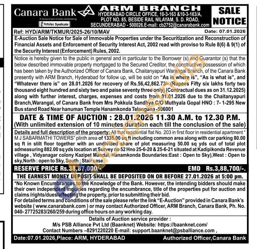 Details and full description of the property: All that residential flat No. 203 in first floor in residential apartment" M J SABARMATHI TOWERS" plinth area of 1335.00 sq ft including common area along with car parking 80.00 sq ft in stilt floor together with an undivided share of plot measuring 50.00 sq yds out of total plot admeasuring 882.00 sq yds location at Survey no 52 Hno 25-6-20 & 25-6-21 situated at Kadipikonda Revenue village, Vidyanagar colony Kazipet Mandal, Hanamkonda Boundaries: East: Open to Sky), West: Open to sky, North: open to Sky, South: Stair case.