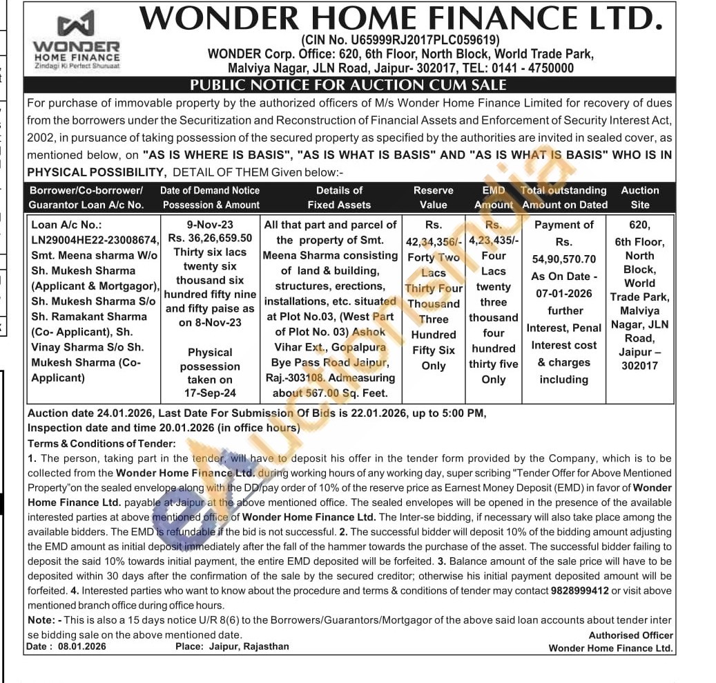 All that pa rt and parcel of the property of Smt Meena Sharma consisting of land & building, structures, erections structures, erections, installations, etc. situated at Plot No.03, (West Part of Plot No. 03) Ashok Vihar Ext., Gopalpura Bye Pass Road Jaipur, Raj.-303108. Admeasuring about 567.00 Sq. Feet