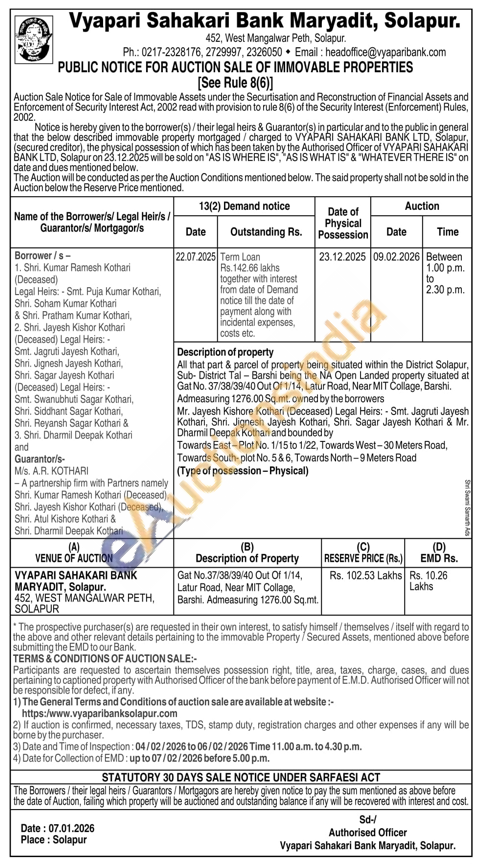 All that part & parcel of property being situated within the District Solapur, Sub-District Tal-Barshi being the NA Open Landed property situated at Gat No. 37/38/39/40 Out Of 1/14, Latur Road, Near MIT Collage, Barshi. Admeasuring 1276.00 Sq.mt. owned by the borrowers Mr. Jayesh Kishore Kothari (Deceased) Legal Heirs: Smt. Jagruti Jayesh Kothari, Shri. Jignesh Jayesh Kothari, Shri. Sagar Jayesh Kothari & Mr. Dharmil Deepak Kothari and bounded by Towards East-Plot No. 1/15 to 1/22, Towards West-30 Meters Road, Towards South-plot No. 5 & 6, Towards North-9 Meters Road