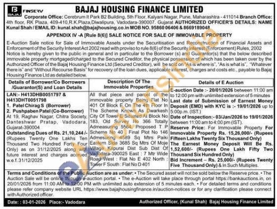 All that piece and parcel of the immovable property Being Flat No 401 Of Block E On The 4th Floor In The Scheme Known As Dwarkesh 183, Old Survey No 366 Totally City Of Tower E Situated At Block Admeasuring 5564, Proposed TP Scheme No 40 Final Plot No 146 Admasuring 4589 Sq Mirs Paiki Eastern Side 3685 Sq Mtrs Of Moje Village Kapurai Dist Sub Dist Of Vadodara-390025 East: 7 Mtr Wide Road West Flat No E 402 North Tower F South: Flat No D 401
