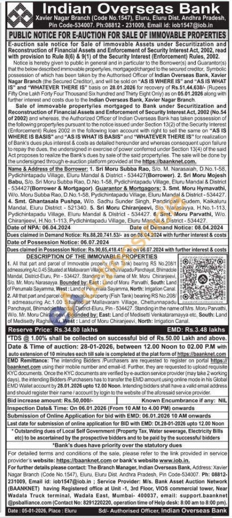 All that part and parcel of immovable property (Fish Tank) bearing RS No.208/1 admeasuring Ac 0.45 Situated at Mallavaram Village, Chettunnapadu Panchayat. Bhimadole Mandal, District-Eluru, Pin-534427. Standing in the name of Mr. Moru Chiranjeevi Slo. Mr. Moru Narasayya. Bounded by: East: Land of Moru Parvath, South: Land of Perumala Sayamma, West: Land of Penumala Sayamma. North: Irrigation Canal 2. All that part and parcel of Immovable property (Fish Tank) bearing RS No.208/1 admeasuring Ac. 1.00 Situated at Mallavaram Village, Chettunnapadu Panchayat, Bhimadole Mandal, District-Eluru, Pin-534427. Standing in the name of Mrs. Moru Parvathi, Wio. Mr. Moru Chiranjeevi, Bounded by: East: Land of Medisetti Venkataramayya etc. South: Land of Medisetty Raghavulu, West: Land of Moru Chiranjeevi, North: Irrigation Canal.