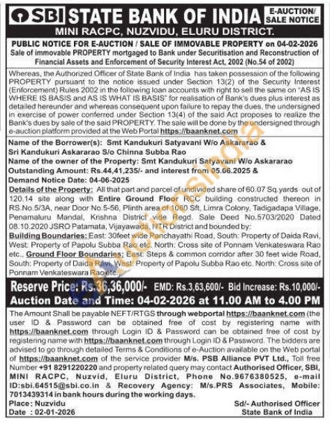 Details of the Property: All that part and parcel of undivided share of 60.07 Sq yards out of 120.14 site along with Entire Ground Floor RCC building constructed thereon in RS.No 5/3A, near Door No.5-56, Plinth area of 1080 Sft, Limra Colony, Tadigadapa Village, Penamaluru Mandal, Krishna District vide Regd. Sale Deed No.5703/2020 Dated 08.10.2020 JSRO Patamata, Vijayawada, NTR District and bounded by: Building Boundaries: East: 30feet wide Panchayathi Road, South: Property of Daida Ravi, West Property of Papolu Subba Rao etc. North. Cross site of Ponnam Venkateswara Rao etc., Ground Floor Boundaries: East: Steps & common corridor after 30 feet wide Road, South: Property of Daida Ravi, West: Property of Papolu Subba Rao etc. North: Cross site of Ponnam Venkateswara Rao etc.,