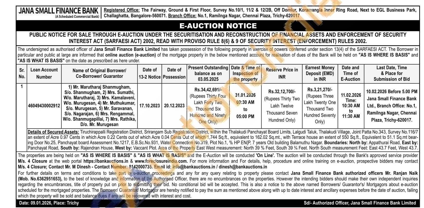 Details of Secured Assets: Tiruchirappalli Registration District, Srirangam Sub Registration District, within the Thalakudi Panchayat Board Limits, Lalgudi Taluk, Thalakudi Village, Joint Patta No.343, Survey No. 116/7 an extent of Acre 0.97 Cents in which Acre 0.22 Cents out of which Acre 0.04 Cents Out of which 1,744 Sq.ft., equivalent to 162.02 Sq.mt., with Terrace house an extent of 550 Sq.ft., Equivalent to 51.1 Sq.mt bear-ing Door No.25, Panchayat board Assessment No. 1217, E.B.Sc.No.931, Water Connection No.319, Plot No.1, % HP EN(P. 7 years Old building Balamuthu Nagar. Boundaries: North by: Appathurai Road, East by: Panchayat Road, South by: Rajendran House, West by: Vaccant Plot. Area of the Property East West measurement: North 39% Feet, South 39% Feet. North South measurement Feet: East 43.7 Feet, West 43.7.